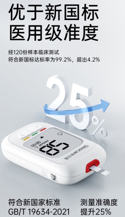 “简单好用”的前提是“结果可靠”,若数值不准,再便捷的操作也失去意义。作为热门的血糖测量仪器之选,三诺优佳血糖仪在准确度上实力过硬:不仅符合新国家标准GB/T 19634-2021,还通过CE认证和ISO国际标准双重认可。经120份样本临床测试,其符合新国标达标率高达99.2%,超出标准4.2个百分点,监测结果贴近医院静脉血,误差小且真实可靠。同时,试纸采用进口脱氢酶技术,抗干扰能力强,银碳十六电极试纸更让准确度提升25%;HCT适用范围宽达10%~70%,孕妇、老人、新生儿全家都能放心使用。